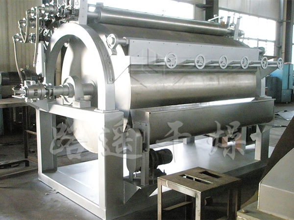 滾筒干燥機是一種內加熱傳導型轉動連續(xù)干燥設備。旋轉的滾筒通過其下部料槽,粘附著一厚度的料膜,熱量通過管道輸送至滾筒內壁,傳導到滾筒外壁,再傳導給料膜,使料膜中的濕得到蒸發(fā)、脫濕、使含濕分的物料得到干燥。干燥好的物料被裝置在滾筒表面的刮刀鏟離滾筒,到置于刮刀下方的螺旋輸送器,通過螺旋輸送器將干物料集中、包裝。