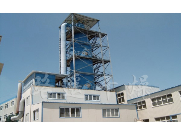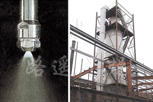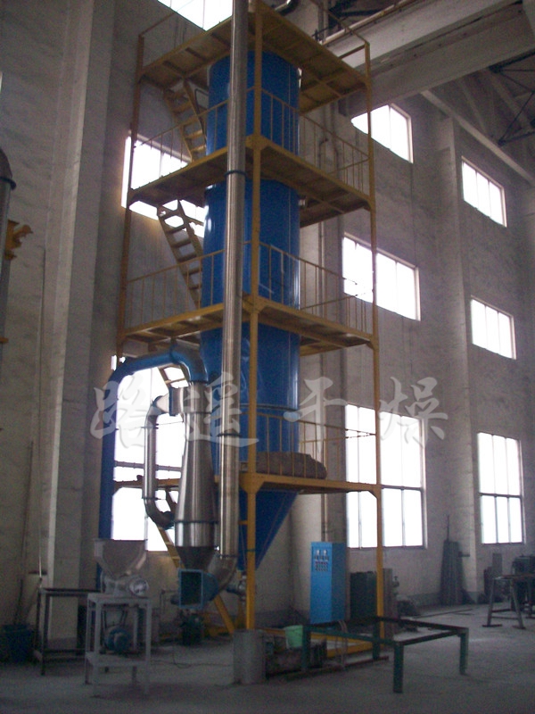 壓力噴霧干燥機工作過程為:料液通過隔膜泵高壓輸入,噴出霧狀液滴,然后同熱空氣并流下降,大部分粉粒由塔底排料口收集,廢氣及其微小粉末經(jīng)旋風(fēng)分離器分離,廢氣由抽風(fēng)機排出,粉末由設(shè)在旋風(fēng)分離器下的收粉筒收集,風(fēng)機出口處還可裝備二級除塵裝置,回收率在96%-98%。