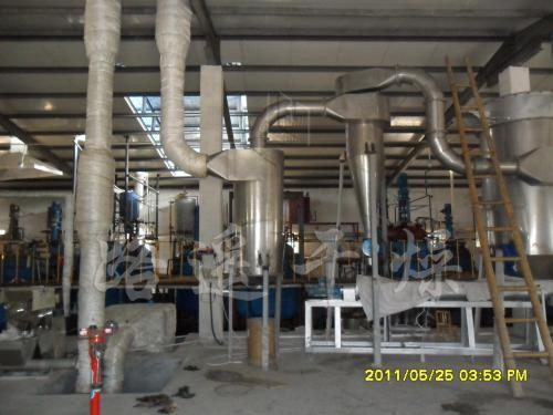 底部強化器設(shè)計獨特,攪拌齒為菱形,其流線性能使風(fēng)阻達到小,設(shè)置在圓錐形料斗內(nèi),分動刀和定刀,粉碎效果顯著,使下落的結(jié)塊物料迅速粉碎為適合氣流干燥的粉粒料,攪拌的另一個主要作用是分散物料,加大了與料斗下面進來的高速熱風(fēng)的接觸面積,于是料斗區(qū)形成了一個強烈傳熱傳質(zhì)的流化床,大部分濕分在料斗區(qū)被干燥。隨著干燥的進行,變輕變細的干料受氣流作用明顯,與氣流一起上升并進一步干燥,后從干燥塔頂部出來進入物料收集···